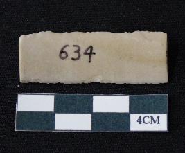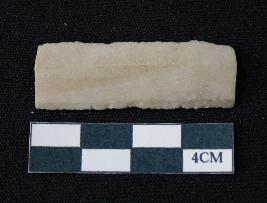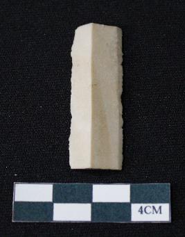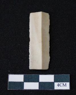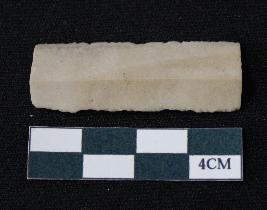 | Description / विवरण | Fragment of blade is off white in color, having smooth body, both ends broken, sides are retouched, mid ridge on the top and triangular section. |
