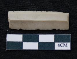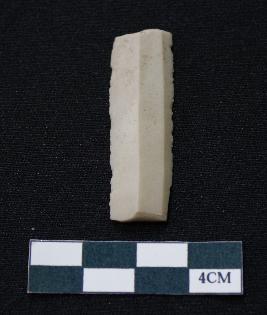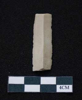 | Description / विवरण | Fragment of blade is white in color, having smooth body, both ends broken, sides retouched, ridges on the top and triangular section. |