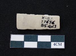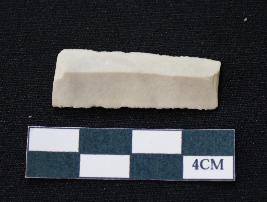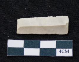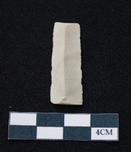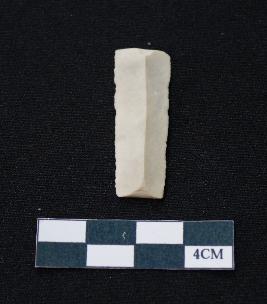 | Description / विवरण | Fragment of blade is white in color, having smooth body, both ends broken, sides retouched, mid ridge on the top and triangular section. |