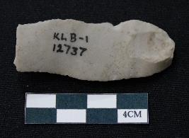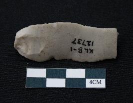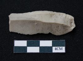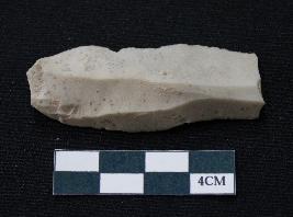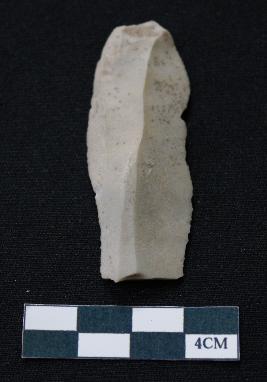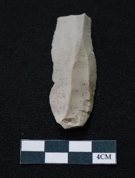 | Description / विवरण | Fragment of blade is off white in color, having positive bulb of percussion at one end, other end is broken, sides are retouched, mid ridge on the top and triangular section. |