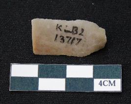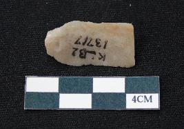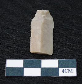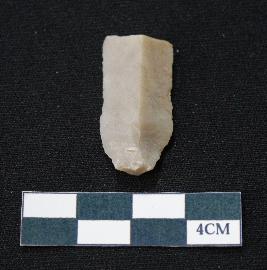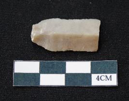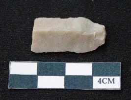 | Description / विवरण | Fragment of blade is dull brown in color, having positive bulb of percussion at one end, other end is broken, sides are retouched, mid ridge on the top and triangular section. |