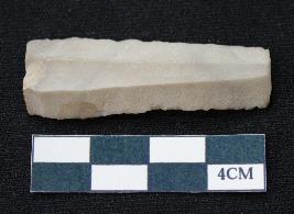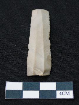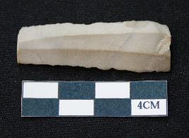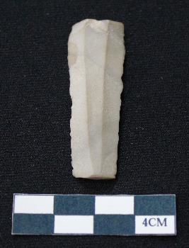 | Description / विवरण | Fragment of blade is dull brown in color, having smooth body, both ends broken, sides are retouched, ridges on the top and thin section. |