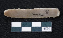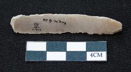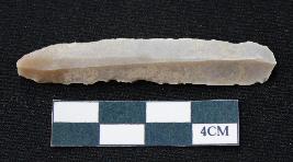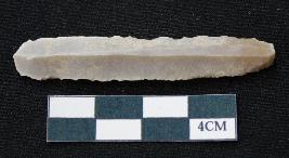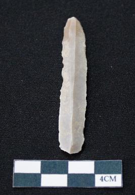 | Description / विवरण | Fragment of blade is off white in color, having one end broken, sides are retouched, mid ridge on the top and triangular section. |