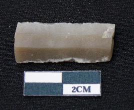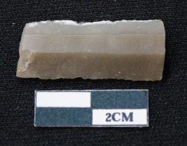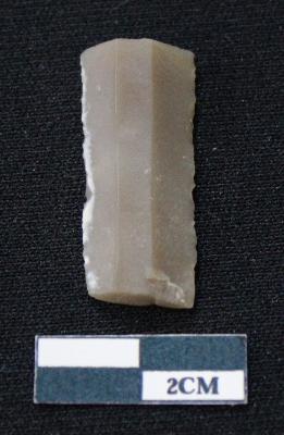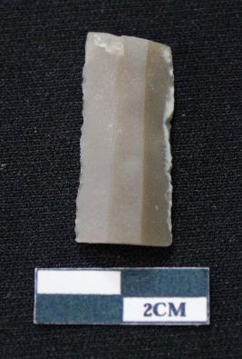 | Description / विवरण | Fragment of blade of dull brown in color, having smooth body, both ends broken, sides are retouched, ridges on the top and triangular section. |