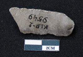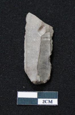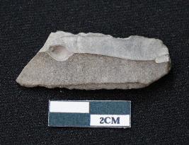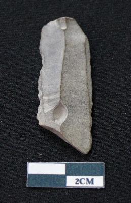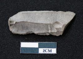 | Description / विवरण | Fragment of blade is blackish in color, made of fine-grained stone, having positive bulb of percussion at one end, other end is broken, smooth body, retouched sides, mid ridge on the top, and triangular section. |