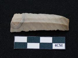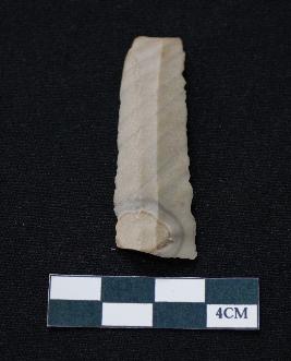| Description / विवरण | Fragment of blade is dull brown in color, having one end is broken, smooth body, retouched sides, ridges on the top, and triangular section. And oblique ripple marks on body |