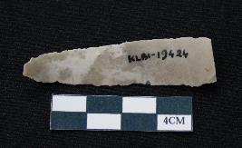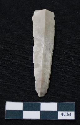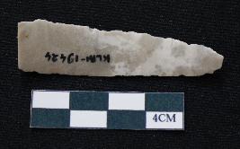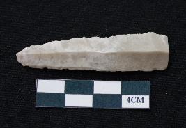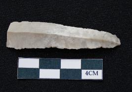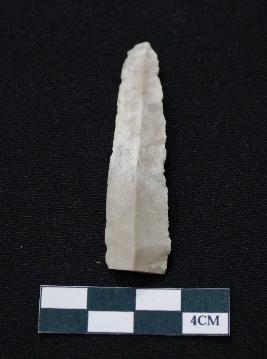 | Description / विवरण | Fragment of blade is off white partly white in color, having one end is broken, smooth triangular body, retouched sides, mid ridge on the top, and triangular section. |