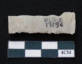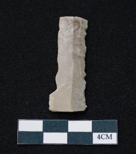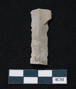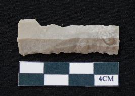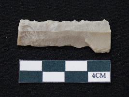 | Description / विवरण | Fragment of blade is off white in color, having both ends broken, one side is retouched, other side has no retouching, mid ridge on the top and triangular section. |