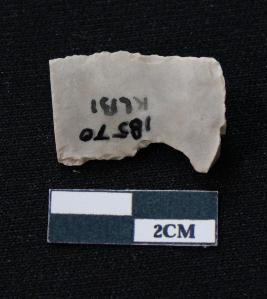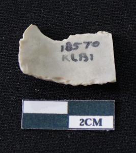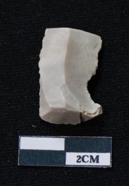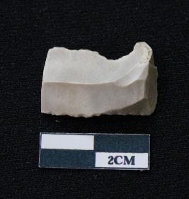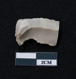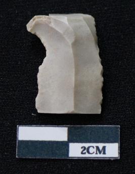 | Description / विवरण | Fragment of blade is white in color, having smooth body, one end broken, sides are retouched, mid ridge on the top and triangular section. |