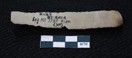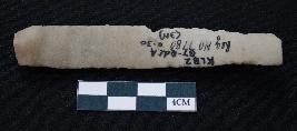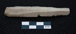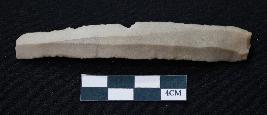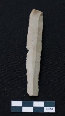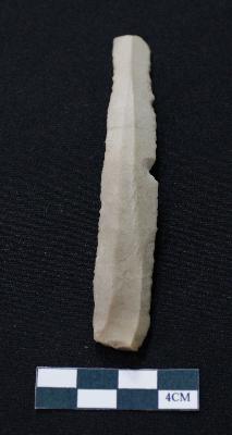 | Description / विवरण | Fragment of blade is dull brown in color, having smooth body, positive bulb of percussion at one end, other end is broken, retouched sides, ridges on the top and triangular section. |