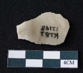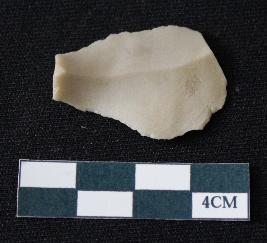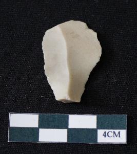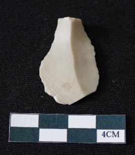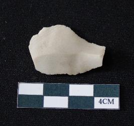 | Description / विवरण | Fragment of blade is off white in color, having smooth body, positive bulb of percussion at one end, other end is slightly broken, retouched sides, mid ridge on the top and triangular section. |
