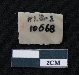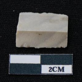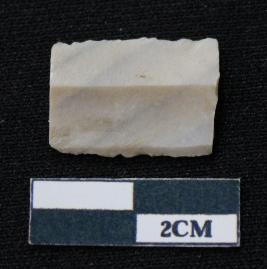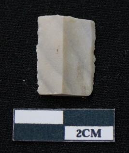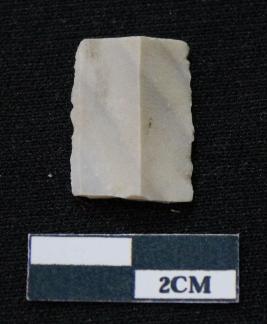 | Description / विवरण | Fragment of blade is white in color, having smooth body, both ends broken, sides are retouched, mid ridge on the top and triangular section. |