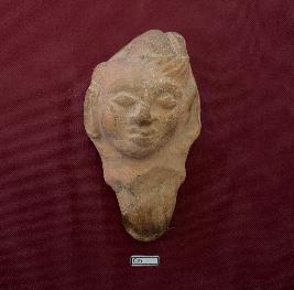 | Description / विवरण | This terracotta Female head with dressed hair. The features are sharp and the face is round in shape with closed eyes. Right ear is visible and it is elongated in nature. |