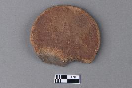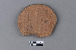 | Description / विवरण | An evenly circular disc of terracotta with a red slip on the exterior surface showing striations. The surface is smooth and it has a grey core. It is broken around the edge. |