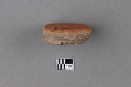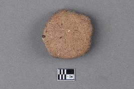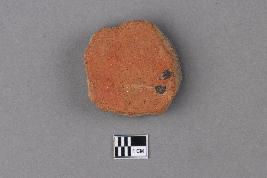 | Description / विवरण | An unevenly circular disc of terracotta with remains of a red slip on the exterior surface. The texture is gritty, and the core is grey in colour. |