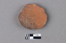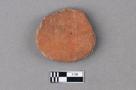 | Description / विवरण | An unevenly circular hopscotch of terracotta with red slip on both surfaces. The texture is smooth, and the core is grey in colour. Soot marks are visible on the exterior surface. |