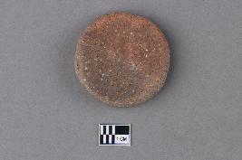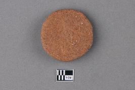 | Description / विवरण | An evenly round hopscotch of uneven thickness. It is reddish in colour with visible mica particles so the texture is gritty, and the core is grey in colour. |