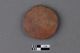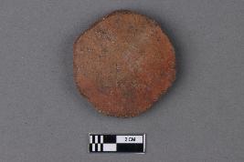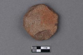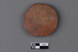 | Description / विवरण | An unevenly circular disc of terracotta with remains of a red slip on the exterior surface. The texture is gritty, and the core is grey in colour. |