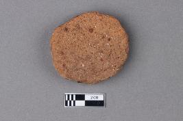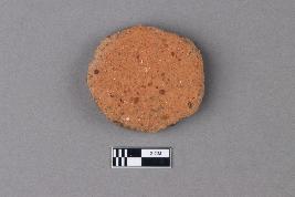 | Description / विवरण | An unevenly circular disc of terracotta with a reddish exterior surface. The texture is gritty with visible particles on both surfaces. |