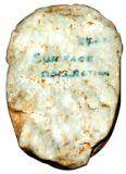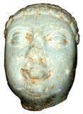 | Description / विवरण | Small broken head of human figurine having round face, with long snubbed nose broken , thick lower lip, almond shaped open eyes, slightly pointed chin, head with curly hair ring lets broken . |