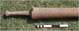 | Description / विवरण | This is a light piece of artillery cast in iron. The cylinder of the gun appears almost parallel but it slightly tappers from towards muzzle. The trunnions provided in the middle of the chase are formed by combination of two thick bars bent in shape of ring around barrel. A vent hole is provided on top part on the breech along with a decorative back site U. The cascabel is formed in shaped of a knobbed rod. |