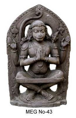 | Description / विवरण | Hanuman seated in yoga with crossed legs and the feet resting on the pedestal. His head is devoid of any kirita or crown. The ears are long and contain bell shaped kundalas. He has four hands. The two front hands are bent inwards with the palms touching each other in anjali mudra. Behind the head is the hair falling on the shoulders on either side. On the right and left chakra and sankha. He wears a kantha mala, a flowing hara which runs up to the navel, a yagnopavita, keyuras, kankanas and manjiras. There is a broad yoga patta tied to the knees which passes around on the hind side. Also can be seen on the top a curved tail which reaches above the head and curled upwards, towards right. All around is a prabhavali decorated with foliage pattern. There is also the mark of tiru nama on the fore head in three vertical lines. The face is zoomorphic with a broad mouth, snubbed nose and thick cheeks. |