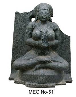 | Description / विवरण | A female devotee seated in padmasana posture, with right foot drawn inwards and resting on the left heap. Both the hands are joined together and held in anjali mudra i.e. worshipping aspect. She has a round head with hair done inwards and combed in half cresentic fashion. She wears kundalas in the ears, a two standed necklace which falls on the chest above the breasts, keyuras, armlets and kankanas in the feet. Her drapery is not clear. But it appears that she wears small ardhoruka and seated on lotus pitha. Around is a prabhavali devoid of carvings. |