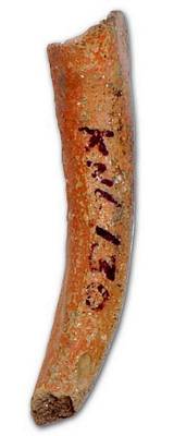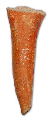 | Description / विवरण | Leg of a red ware pot with flat base and slightly curved body, pointed foot end It looks like a horn of bull |