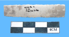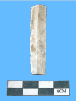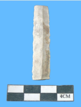 | Description / विवरण | A fragment of whitish parallel sided blade serrated on both sided slightly smooth surfaces. |