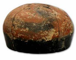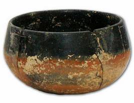 | Description / विवरण | Broken black and red ware deep bowl with round base and incurved pointed rim. Graffiti mark arrow, brahmi letter ma on top portion. |