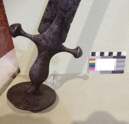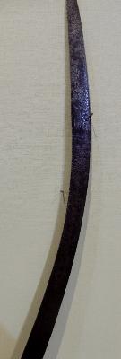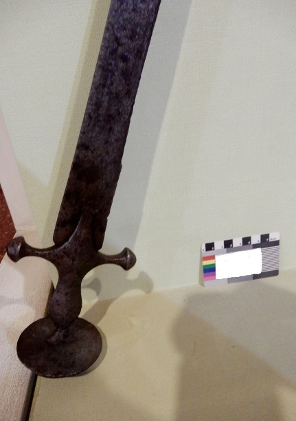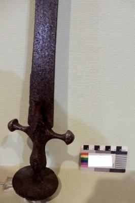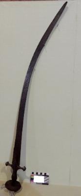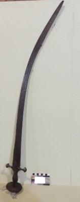 An Iron Sword which is slightly curved with a pointed tip. The sword is sharpened cutting edge on one side of the blade. Sward is fitted with a grip and a hand guard.