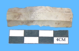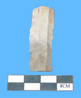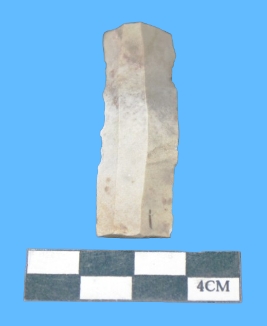 | Description / विवरण | A fragment of parallel side blade having serrated and notched margins in half part is greyish and half part is dark greyish color with smooth surface. |