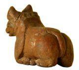 | Description / विवरण | A stone nandi with mouth open and tail hanging down. It is decorated with thick band design around the neck. |