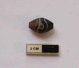 | Description / विवरण | A bead in biconical shape. It is partially damaged. It is black and gray in color. |