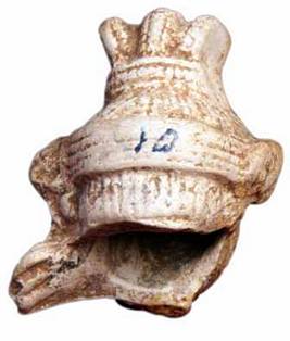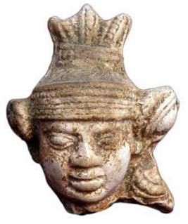 | Description / विवरण | Head of a male figurine made of Chinese clay, wearing a jeweled turban depicted with circular beaded band showing side fastening and patra kundalas one side, where as the other side is missing. Top of turban is shown in three folds looks like trident. It shows protruding eye balls, oval face, stout snubbed nose, thick lips, smiling face. |