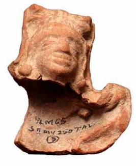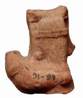 | Description / विवरण | Broken head of a human figurine with a little bust portion. She wears patrakundala, hair tied with makarika ornament. Combed hair tied with simple a band. She wears keyura to her on left hand. It shows oval face with open eyes, thick lips and long snubbed nose. The tied head band is seen on the back side |