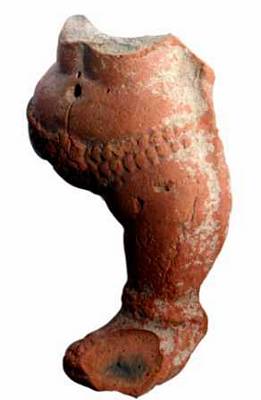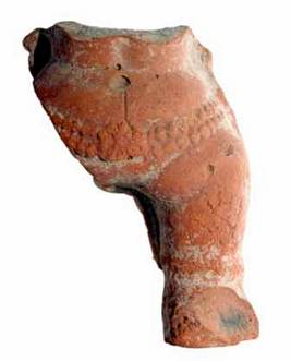 | Description / विवरण | A broken waist and leg of a terracotta figure. The abdomen shows a prominent nave with curved waist. She wears double banded beaded necklace and beaded anklet. Foot is broken. It is treated with fine slip and wash. |