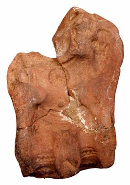 | Description / विवरण | A terracotta mould depicted with a standing male figurine male with left hand raised, wears a hara with a big wheel designed pendent, mekhala, wrist band, anklets a design is shown around the shoulder probably a half blouse. Right portion broken. |