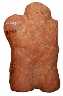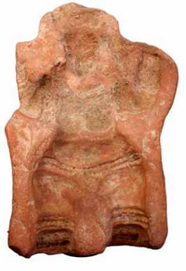 | Description / विवरण | A terracotta mould depicted with a female figurine, with upraised hands, prominent breast, mekhala and anklets. Upper portion is eroded. |
