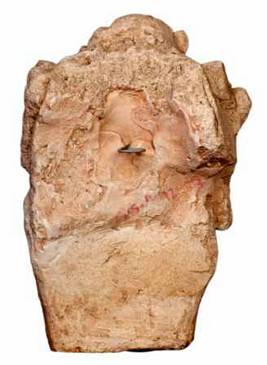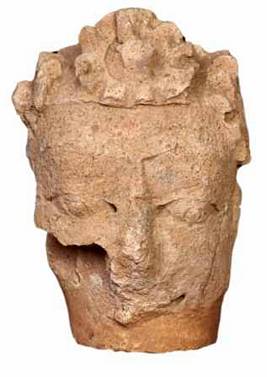 | Description / विवरण | Broken head of a human figurine with combed hair tied into a band decorated with big jewel in the centre and on either side. Right below the eye portion broken, large pointed nose, thick eye brows, diamond shaped eyes with pinched protruding round eye balls. |