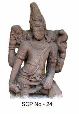 | Description / विवरण | Saivate dwarapala standing in Katisama posture. The lower part is broken. The head is adorned with a tall jatamakuta in conical shape tapering towards the top. The ears have chakra kundalas. He has four hands. The rear right hand is raised up in pataka hasta pose while the left rear hand holds a serpent or noose. The lower right hand hangs down freely touching the thigh while the lower left also hangs down loose and placed on the upper part of the mace broken . Adorned with a tight kanta mala, thick yagnopavita, udara bandha, keyuras and bangles. There is a kati sutra around the loin with a short lower garment and girdle mekhala . The face is oval in appearance and characterized by bulbous cheeks, thick lips and slightly snubbed short nose. It is a broken sculpture. |