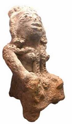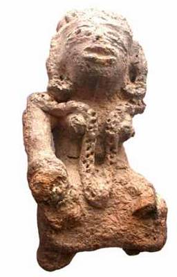 | Description / विवरण | A terracotta figurine of mother goddess seated in ease, keeping her hands on knees left one broken . She wears a long flower garland passing in between the breast and a circular broad pendent reached upto ankle level. She has abnormal facial features having broad, snubbed nose with round nostrils, broad diamond shaped eyes with pinched eye balls, wide open mouth marked by a horizontal slit. Long ear lobes with kundalas, a head band, combed hair locks are arranged just like short jatakamakuta. It is a decorative element on the sikhara of the medieval temple belong to the pala period. |
