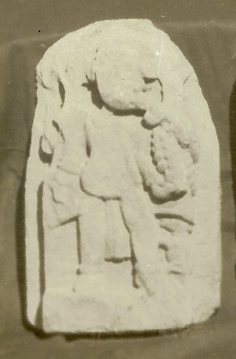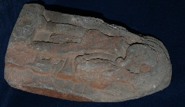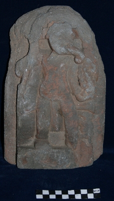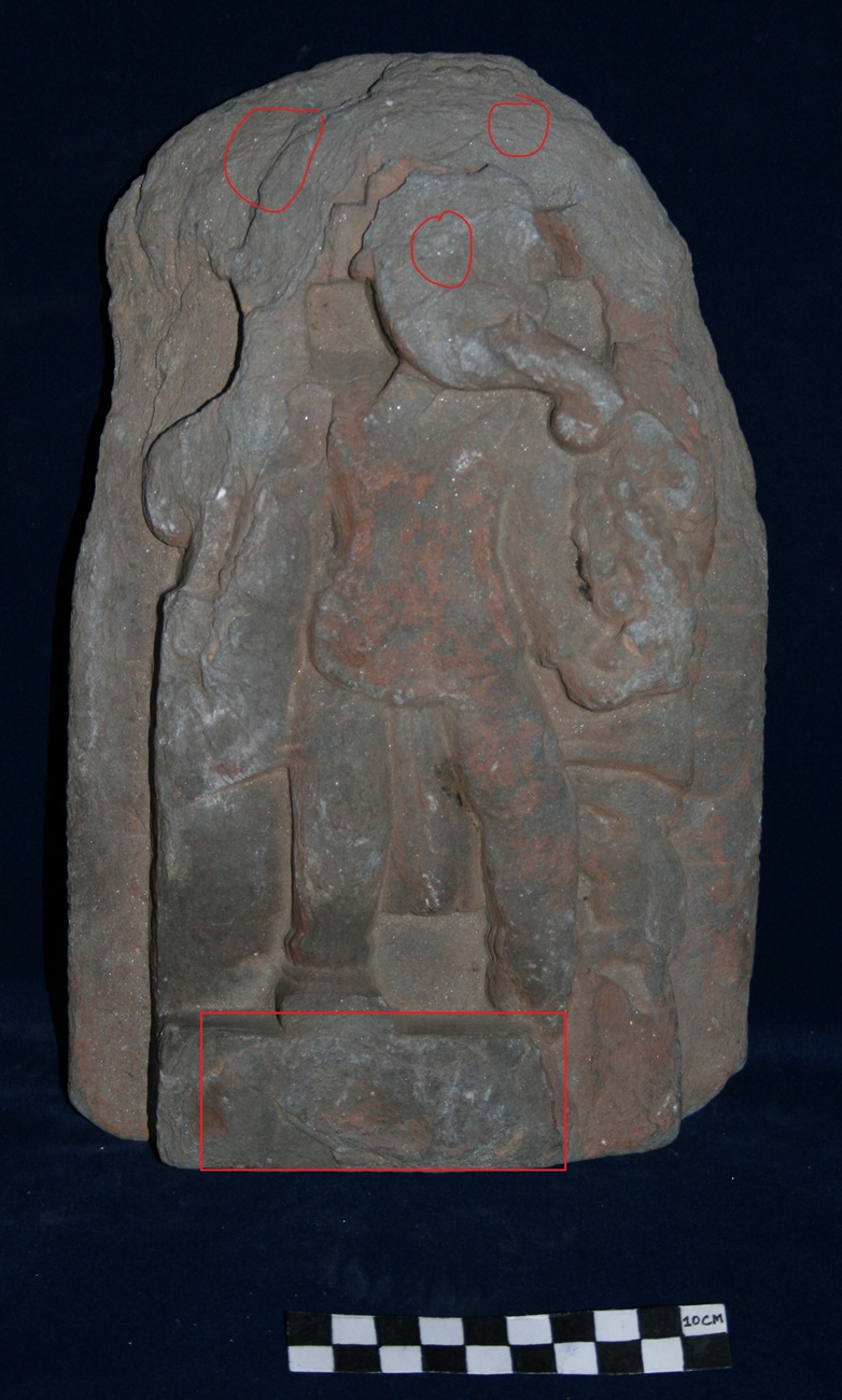 In this panel Ganesha is depicted standing. The image of Ganesha is highly eroded. His trunk body features and only Dhoti can be identified. A mouse is also depicted on the left side near the calf of the deity.