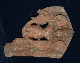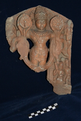 The Surya is standing in sambhangana posture. He is depicted with two hand holding lotus flower in both hand. He is decorated with Kiritmukut, necklaces, garland and griddle. Hands and lower portion of the panel is broken. In the remaining part of the lower plank on left side, devotees are also depicted. Similarly two devotees are depicted on the either site toward the upper edge of Sun but their facial features are broken.