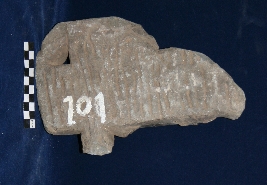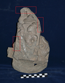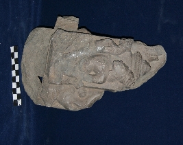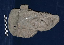 Flying Celestial probably a part of a sculpture or panel. In the present remains, a Flying Celestial is depicted holding stem of a flower bud. He is adorned with crown, earrings, bracelets, necklaces and armlets. He is depicted wearing Dhoti as well. On left side of the flying celestial, a elephant head is depicted extending his trunk in gratitude. a miniature shrine is also depicted behind the flying celestial.