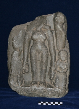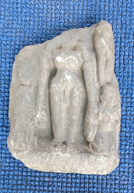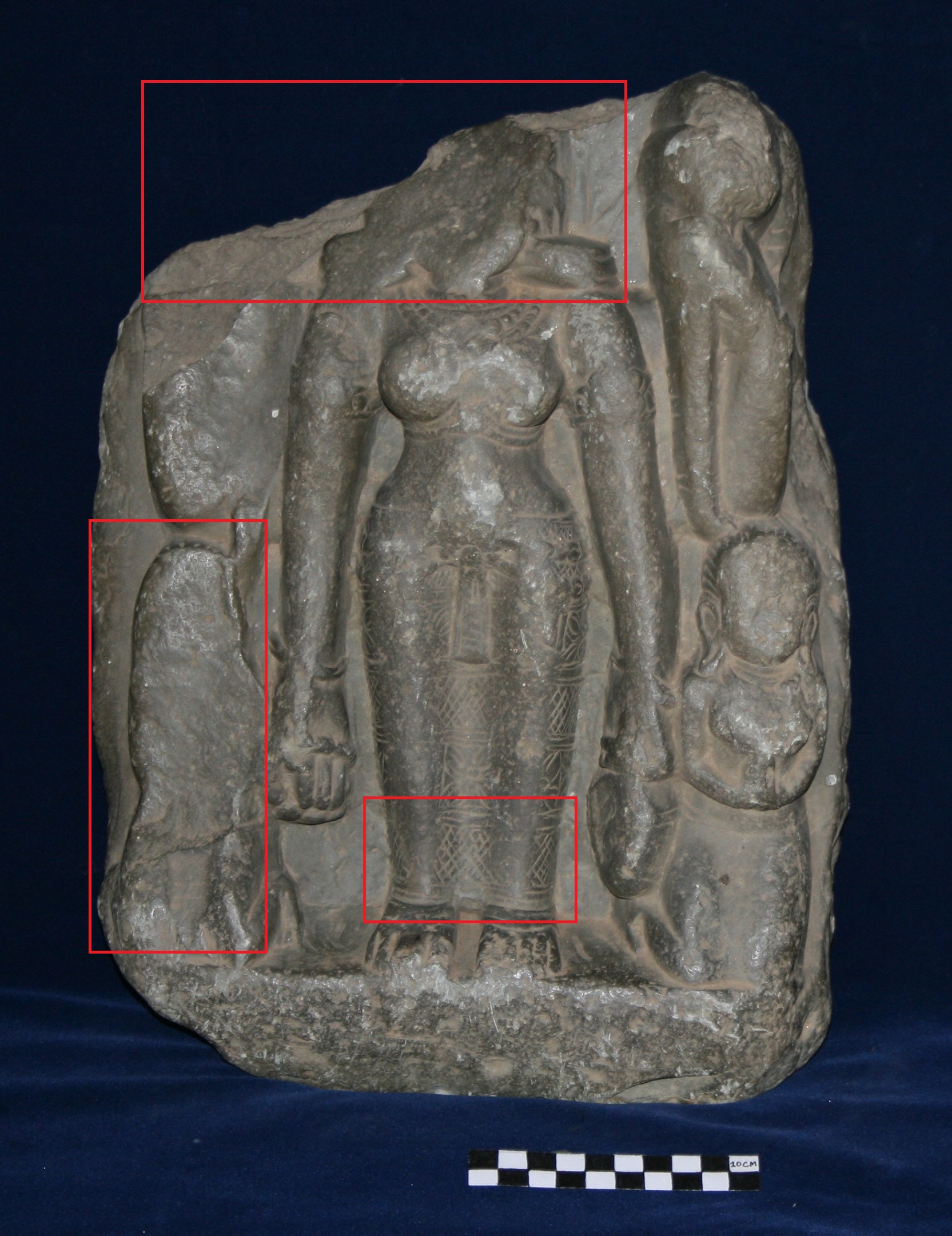 Head of the deity and upper part of the sculpture is broken/missing. Partially mutilated