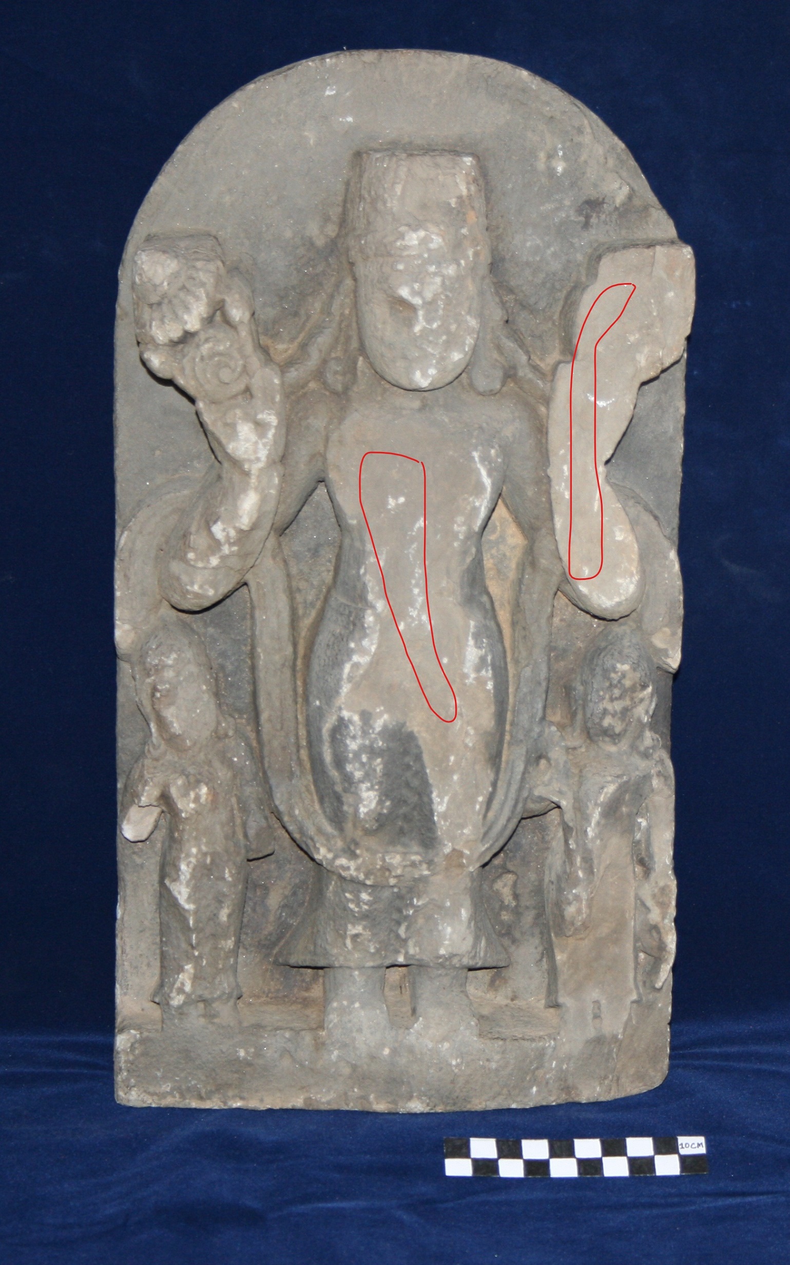 Two-armed image of Surya standing in samabhanga pose and holding a stalk of full bloom lotus in both his upraised hands. He is adorned with a mukut, ear ornaments and girdle He wears a lower garment and high boots. One attendant on each side near the feet (may be Pingala and Dandi) are depicted. Facial features of main deity and attendants are worn off.
