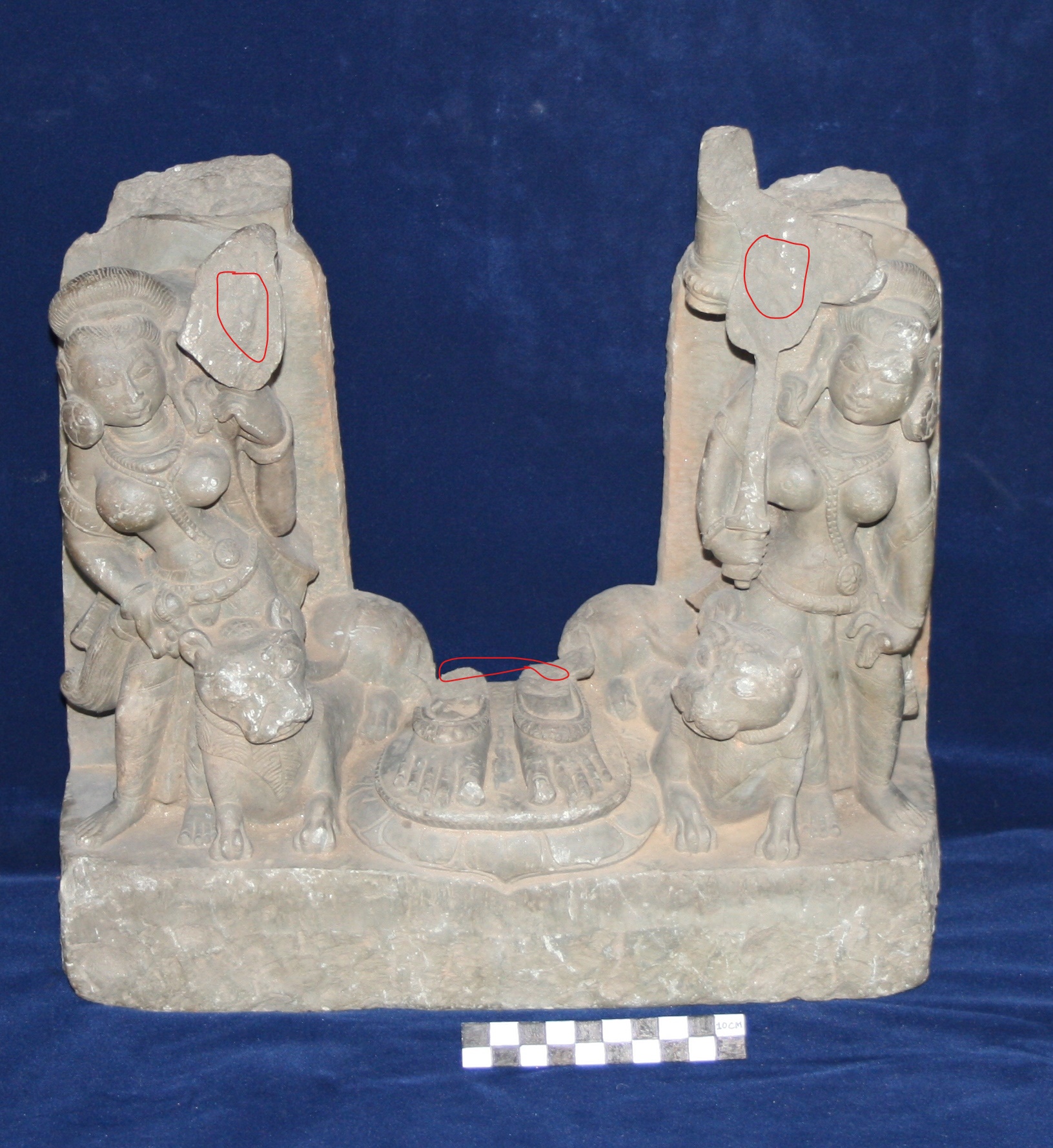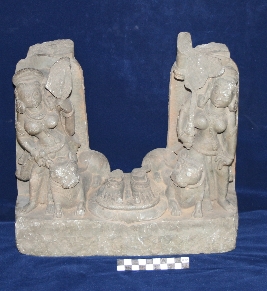 Fragment of stone Sculpture. The deity can t be defined just based on the remaining part of the sculpture. A deity is standing on a full bloomed lotus flower, situated in the middle, flanked by two females either side on the lower portion. The female attendants are adorned with juda, earrings, bangles, necklace and griddle. These attendants are shown wearing dhoti and uttariya. Two lions alongside of these attendants are also shown.