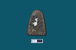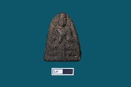 | Description / विवरण | A miniature seated figurine probably a Jaina divinity. The face is partly visible with a headgear on top. There are two circular objects placed on each side of the ear. Both hands are placed on the knee portion. The object is triangular in shape. |