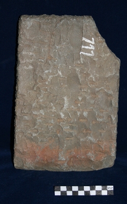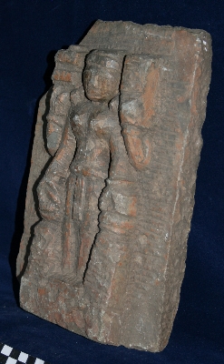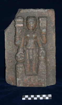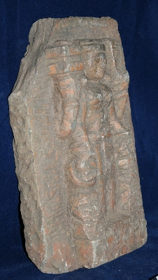 This piece of stone is work in progress; it s a unfinished sculpture. The deity is shown with four hands holding a long stalk of something in both upper hands, which is unfinished. He She is holding kamandal in left lower hand and attribute of lower right hand is unidentified. The deity is depicted with crown, and a dhoti as well. Apart from the few facial features of the sculpture, body proportions and pedestal it is not finished, it is work in process.